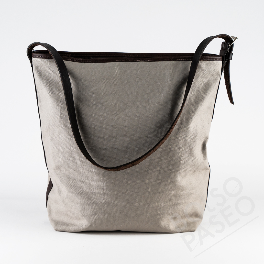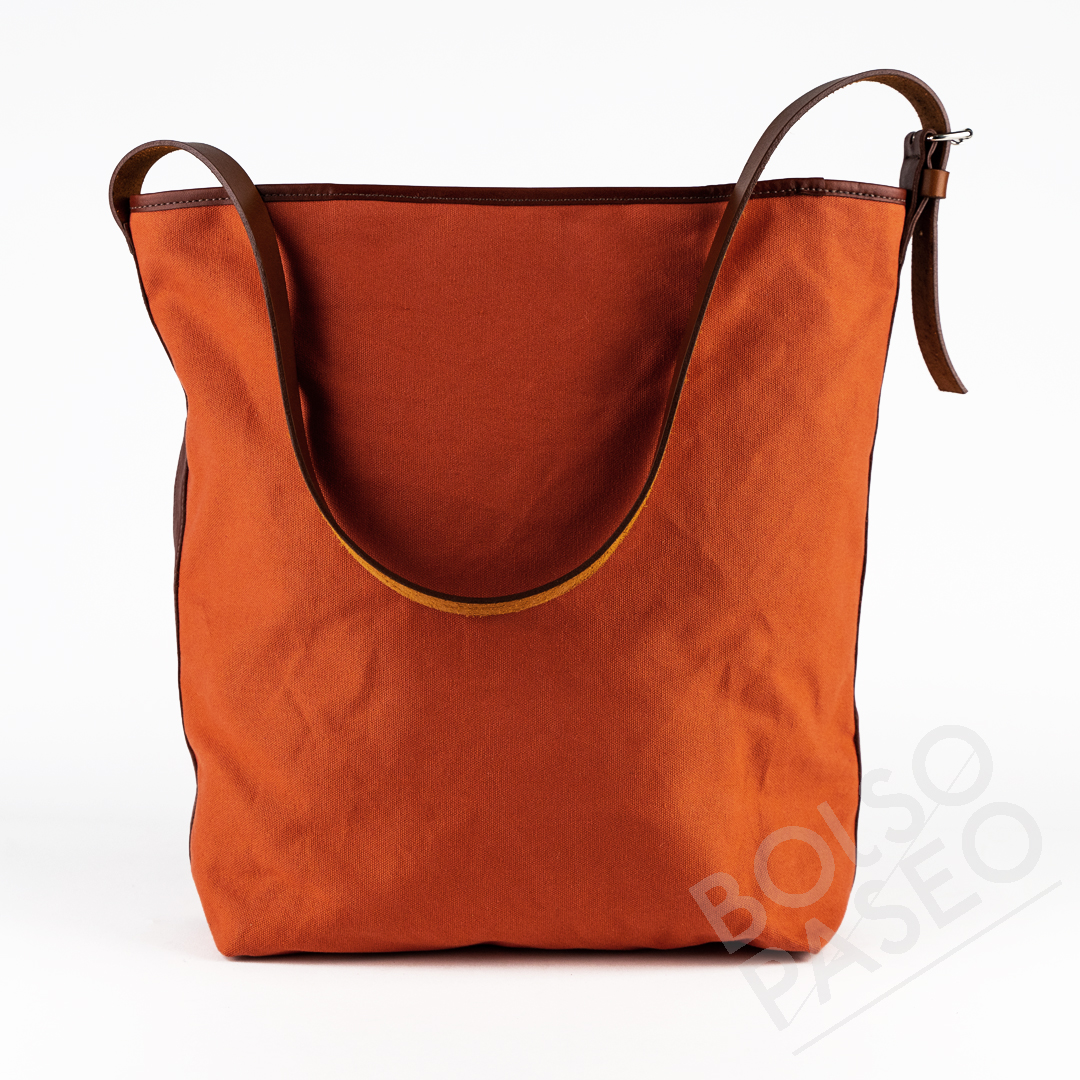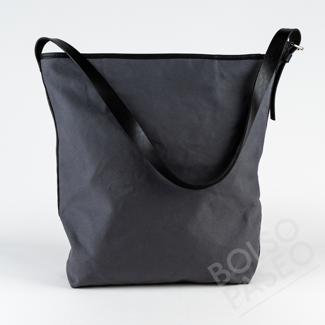 El bolso MONA es de estilo tote bag, fabricado con tela de algodón y detalles de cuero.